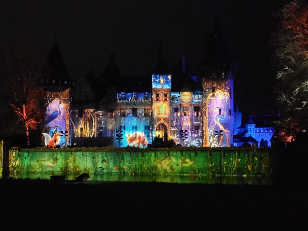 Ik had van een vriendin twee kaartjes gekregen voor de Lumineuze Nachten bij kasteel De Haar, omdat zij op vakantie ging. Ik vroeg mijn zus mee en na vroeg gegeten te hebben, reden we om 17.15 uur weg. De drukte onderweg viel heel erg mee, dus waren we mooi op tijd voor ons tijdslot van 18.30 uur. We zagen direct de mooi verlichte poort. Daarna liepen we door naar de tuinen waar de route begon. Er werd steeds door de speakers een verhaal verteld over de dieren van het landgoed en daar sloten de projecties op aan. Soms moesten we wat langer wachten, omdat veel mensen middenop het pad bleven staan, waardoor het lastig was om een plekje te vinden met de rolstoel. Dan wachtten we totdat iedereen wegging en het verhaal weer opnieuw begon. Verder was de route heel erg mooi en goed begaanbaar met de rolstoel. Ik was echt onder de indruk van de grootte van het kasteel en de projecties. Zeker een aanrader om een keertje gezien te hebben.