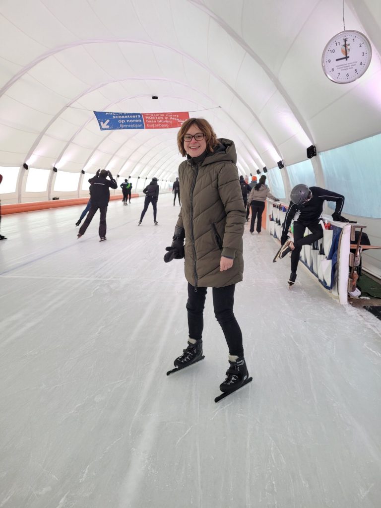 Vorig jaar had onze dochter voor het eerst een cursus op noren schaatsen in Rotterdam gevolgd. Dit jaar wilde ze dat wel weer. Maandagochtend ging mijn vader mee, dus had ik een chauffeur. Hierdoor kon ik zelf ook schaatsen. Twee vriendinnen van onze dochter uit haar zwemteam deden ook mee met de cursus en ze zaten in hetzelfde groepje. Na 20 minuten ging ik naar de kantine om bij te komen. Ik had mijn schaatsen aangehouden, want ik wilde later ook nog wel een stukje schaatsen. Mijn vader kwam ook even koffie drinken en daarna gingen we nog terug het ijs op. Ik nog 20 minuten. Total loss was ik hierna, maar ik hoefde verder even niets meer.